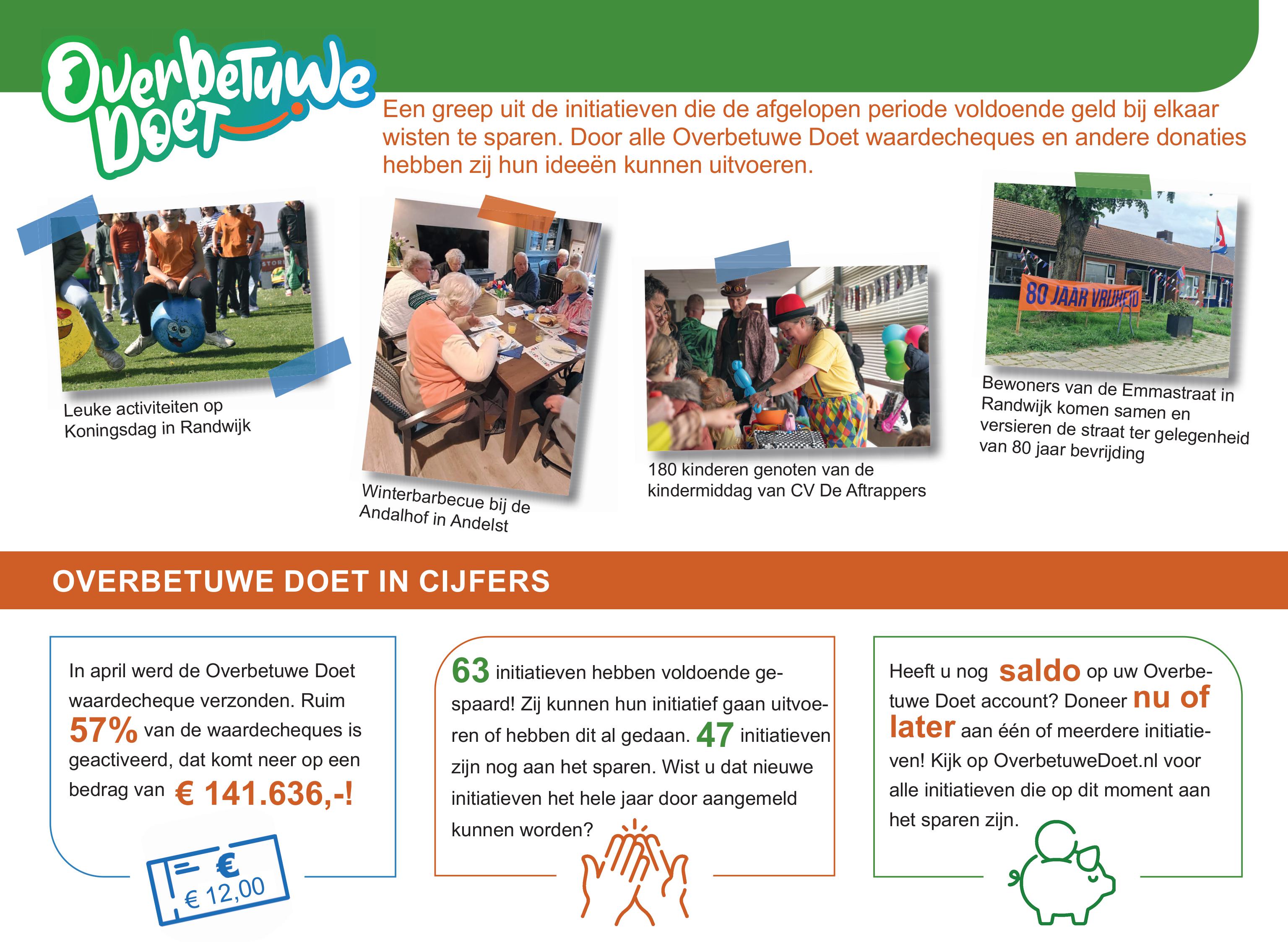 In april vielen de Overbetuwe Doet waardecheques op de deurmat. Tot en met 29 mei konden de cheques ingezet worden. Er werden waardecheques van €12,- verstuurd waarvan 57,4% ingezet is. Dat komt neer op een bedrag van €141.636,-.