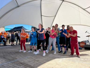 Daarna dirigeerde de spreekstalmeester alle deelnemers naar het hoofdveld voor een gezamenlijke warming up. Op vrolijke muziek werden de spieren los- en warm gemaakt en groeide er een saamhorige sfeer. Vervolgens waaierde iedereen uit over het evenementsterrein naar de sport of beweegvorm van zijn/haar keuze.