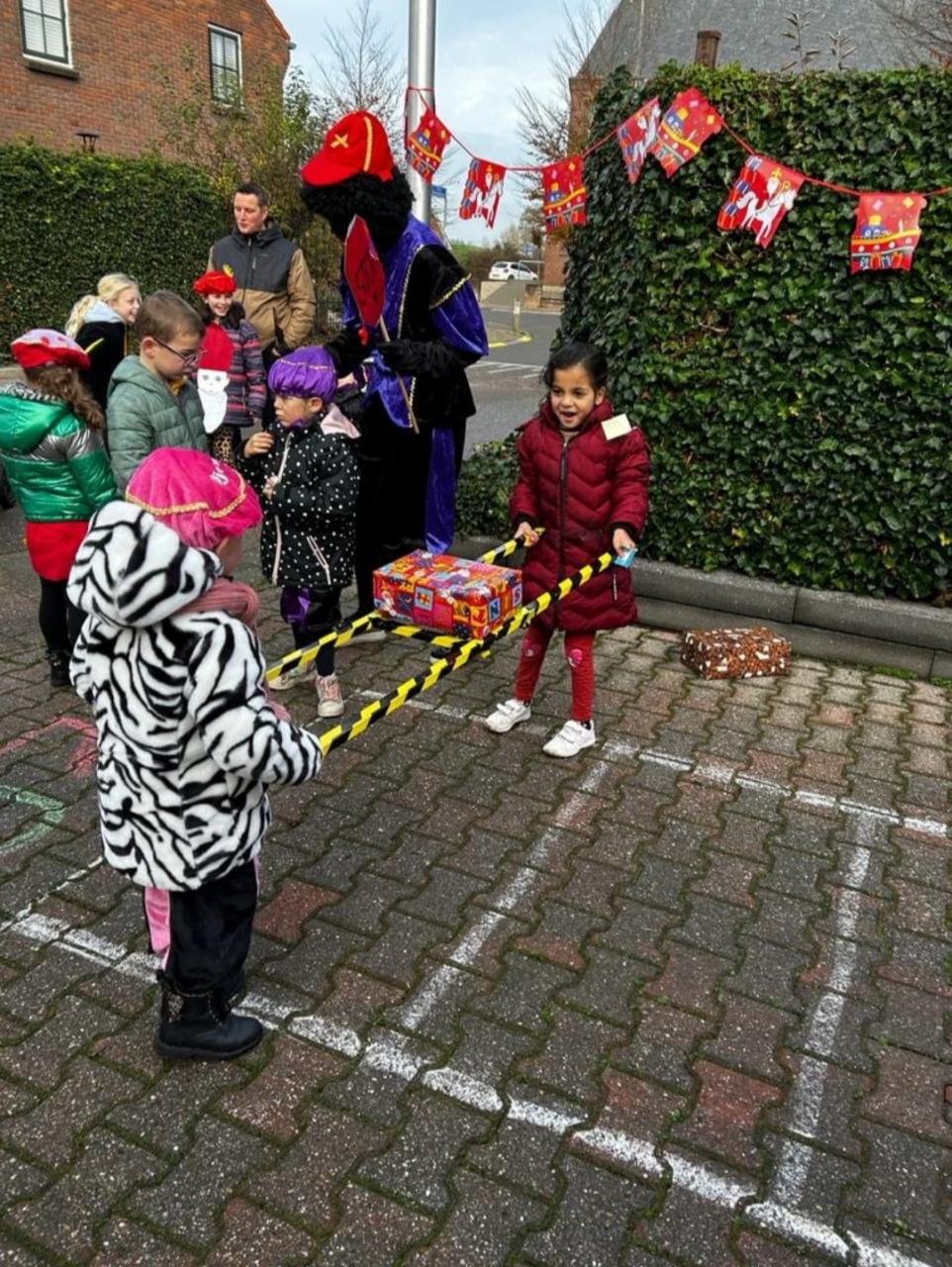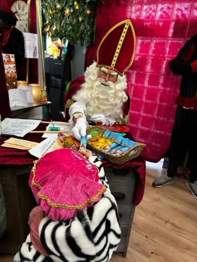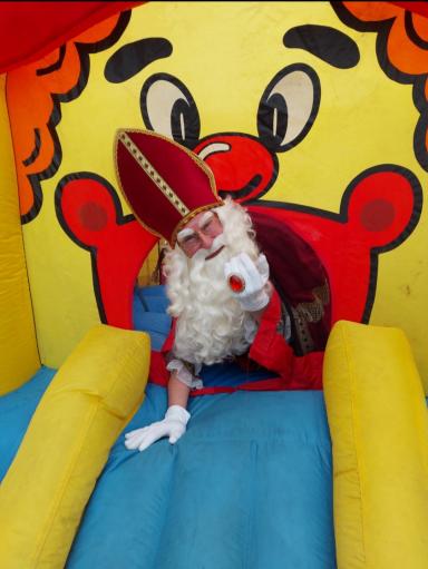 Aan het eind van de rit kwamen ze bij Sinterklaas aan, waar ze tijdens het wachten konden springen op het springkussen en glittertattoo's konden laten zetten.