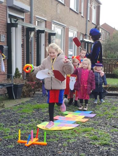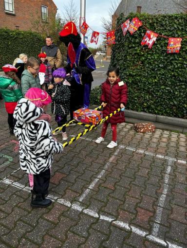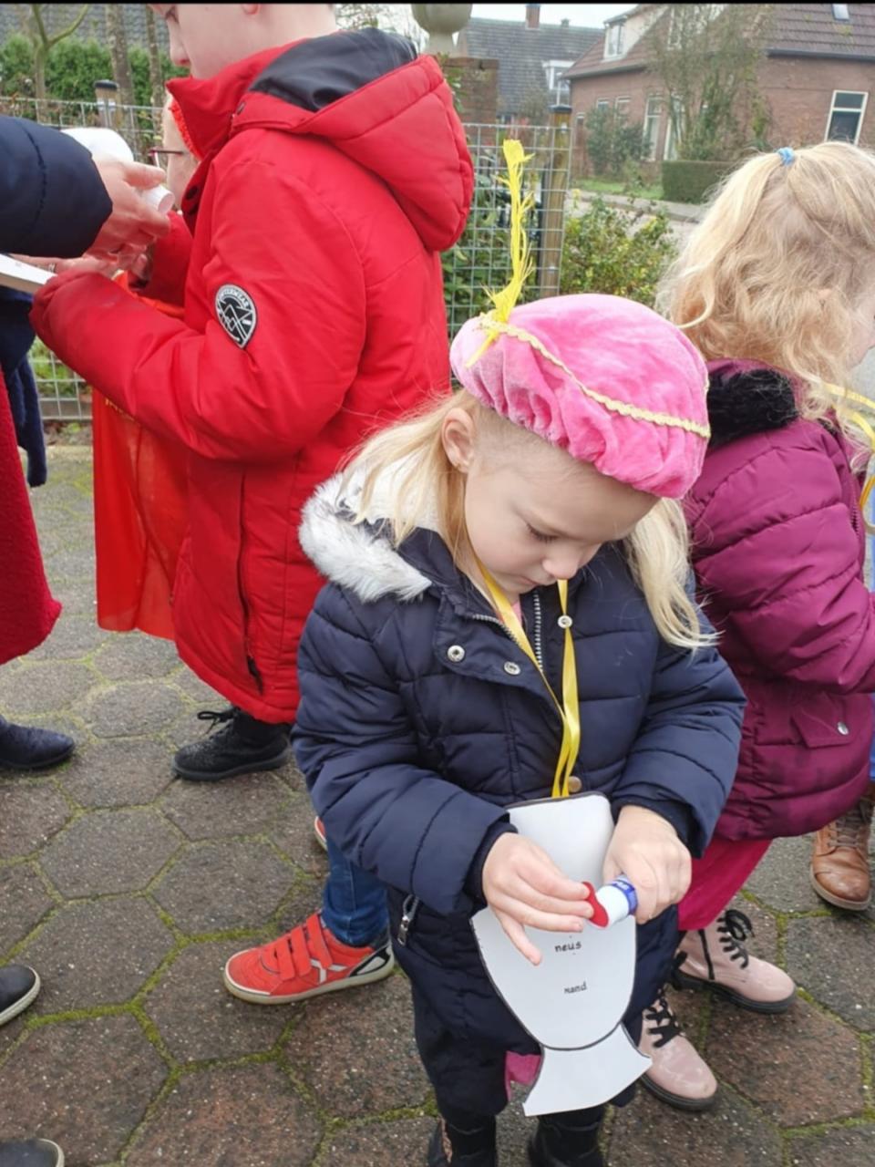 De 'kale' hoofden werden aan de kinderen uitgedeeld en in groepjes gingen ze met een aantal pieten en ouders, opa's en oma's op pad! Van spel naar spel om na ieder gevonden onderdeel een stukje Sint op het kale hoofd te kunnen plakken. Natuurlijk met de nodige snoep en drinkposten onderweg.