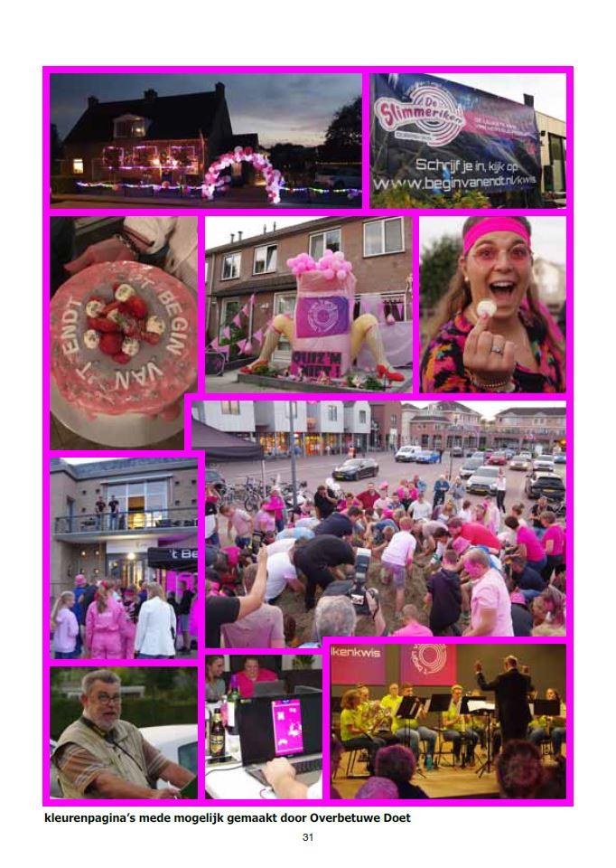 In uitgave oktober van Dorpskrant Herveld-Andelst was de volledige middenpagina ingeruimd voor een collage kleurenfoto’s van de tweejaarlijkse Slimmerikenkwis van Stichting ’t Begin van ’t Endt. De kwis telde dit jaar maar liefst 100 deelnemend teams die de uitdaging aangingen, met elkaar en met de inventieve opdrachten die ‘de mannen’ bedacht hadden.