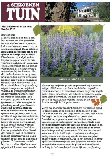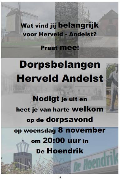 DKHA202311: dorpsavond, De Nacht Van, kindermiddag Slimmerikenkwis, tuinrubriekIn uitgave november van Dorpskrant Herveld-Andelst hebben we vier pagina's A4 kunnen plaatsen vanuit de bijdragen. Op pagina 14 drukten we een kleurenposter af met een oproep voor de dorpsavond op 8 november in het dorpskhuis. Stichting Dorpsbelangen Herveld-Andelst organiseerde op de tweede woensdag van november een informatieavond voor alle inwoners, met informatie over hoe te komen tot een dorpsontwikkelingsplan voor de komende jaren.