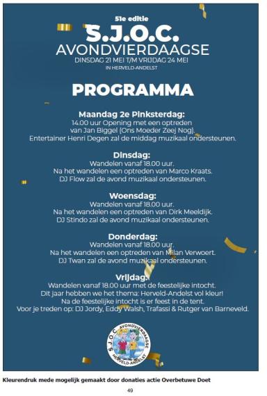 De jaarlijks drukbezochte S.J.O.C. Avondvierdaagse werd dag voor dag helder opgesomd op pagina 49.