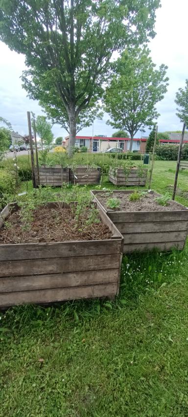 Op advies van enkele kleinfruit kwekers hebben we naast de aanplant in de kisten ook wat kleinfruit in de volle grond (aan de draad) geplaatst voor optimale opbrengst. Inmiddels staan er al heel wat fruit planten, struiken en bomen waaronder kruisbessen, diverse aardbei soorten, (aal)bessen), frambozen, bramen, moerbeien, peren, appels, pruimen en kersen. Ook zijn er een aantal perken gemaakt met door vogel, vlinder en bijen beminde struiken en bloemen.