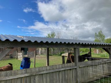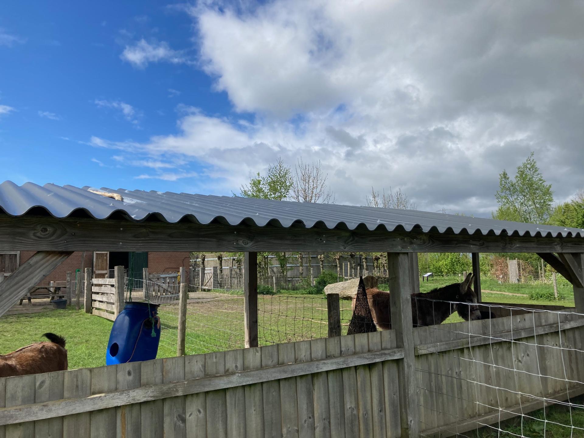 De daken van de buitenren en stal zijn weer op orde. De platen zijn goed vastgezet met strips en een deel is voorzien van nieuwe platen. De dieren kunnen weer lekker buiten zijn of hebben een schuilplaats bij veel zon of regen. Zie bijgevoegde foto.